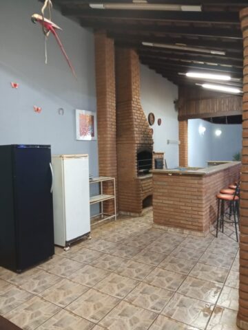 O espaço possui 02 dormitórios sendo 01 suíte com ar condicionado totalizando 10 acomodações em beliches. Cozinha completa com fogão, geladeira e utensílios domésticos (pratos, talheres e panelas). Área de churrasco completa com churrasqueira, pia, balcão, forno e fogão a lenha, fogão industrial, freezer, 10 jogos de mesas com cadeiras, mesa e bancos de madeira. Ventiladores em todos os cômodos.