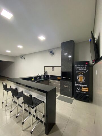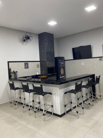 O espaço possui 02 dormitórios com ar condicionado e acomodações para 07 pessoas. Cozinha com fogão, forno, micro-ondas, geladeira, cervejeira e filtro de água. Varanda com churrasqueira, balcão com 06 banquetas e 10 jogos de mesas.