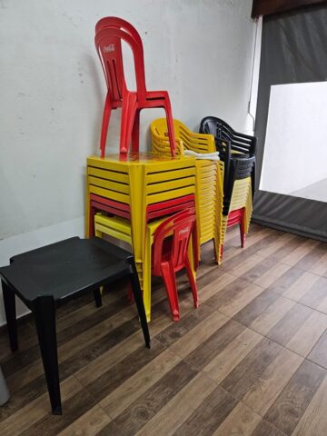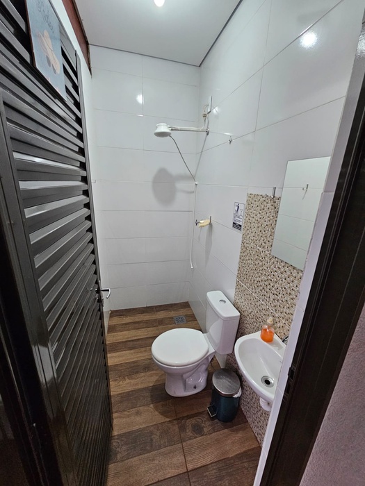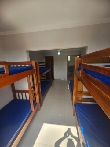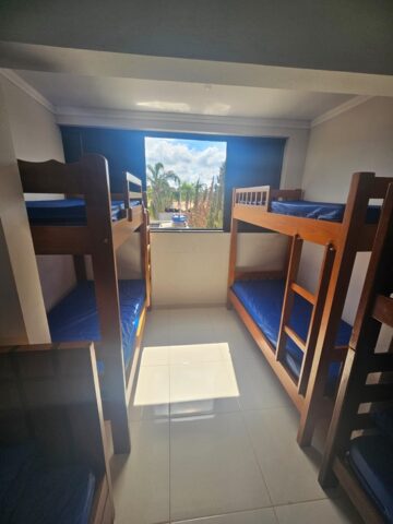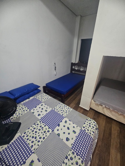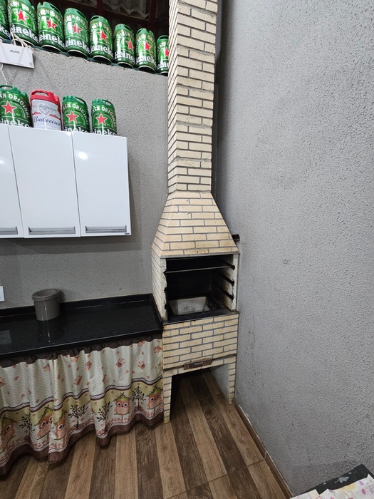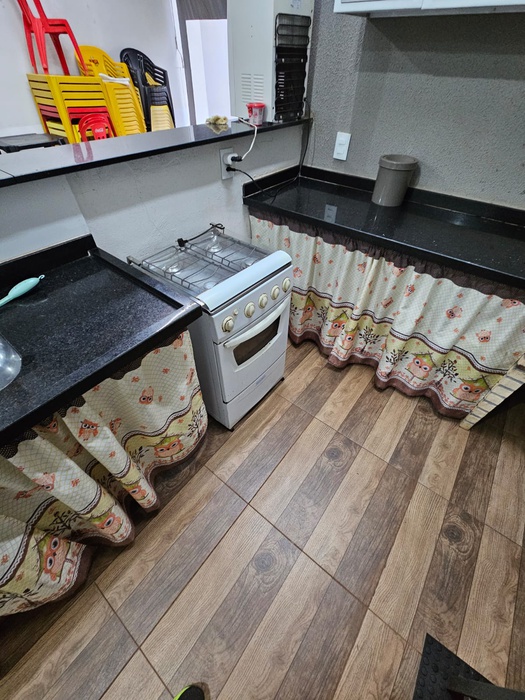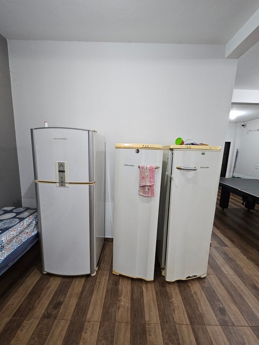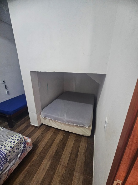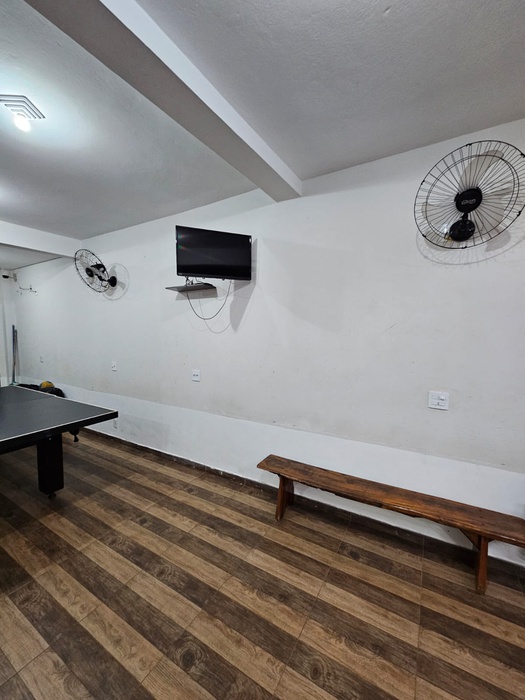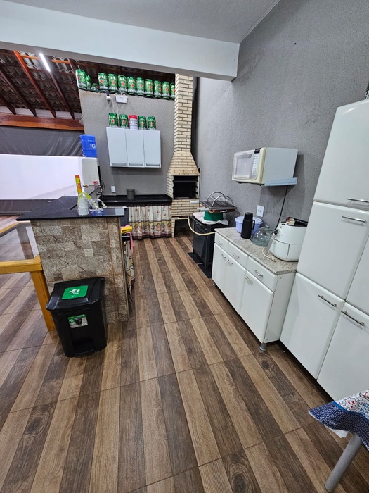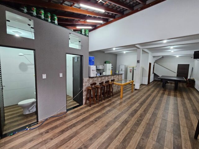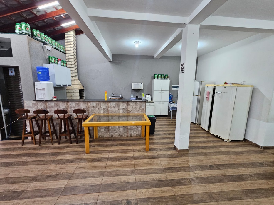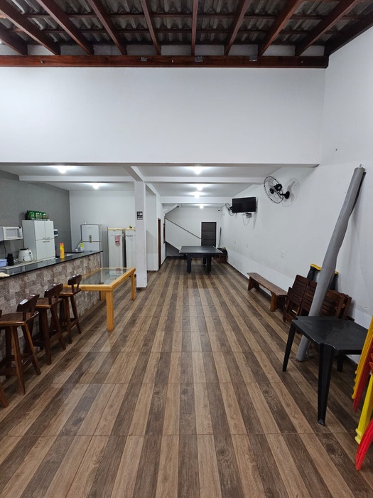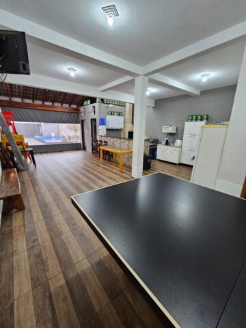 O espaço possui 02 dormitórios sendo uma suíte com acomodações para 13 pessoas em camas. Área de churrasco com churrasqueira, pia, bancada, freezer, 02 geladeiras, fogão 04 bocas, fogão industrial 02 bocas, 10 jogos de mesas e cadeiras, mesa retangular para bolo ou refeições, banco de madeira e televisão.